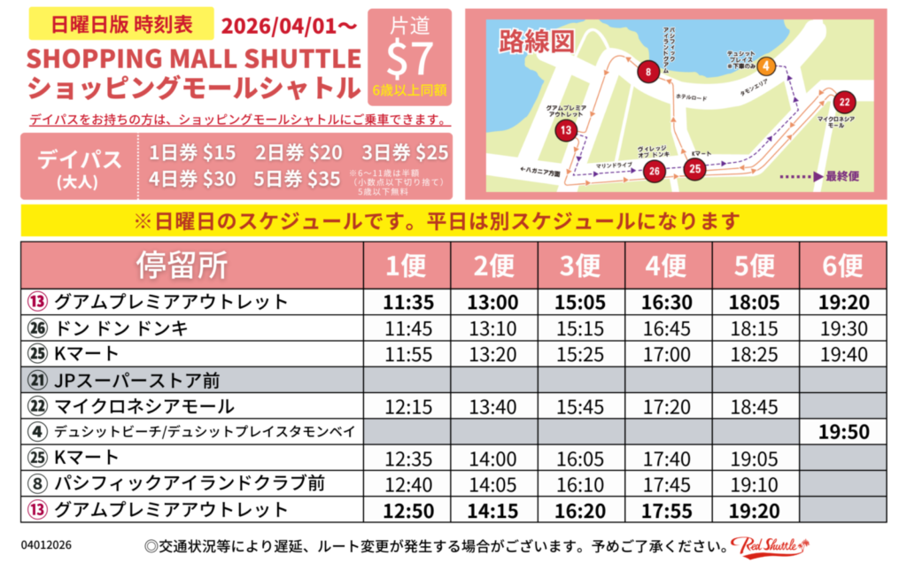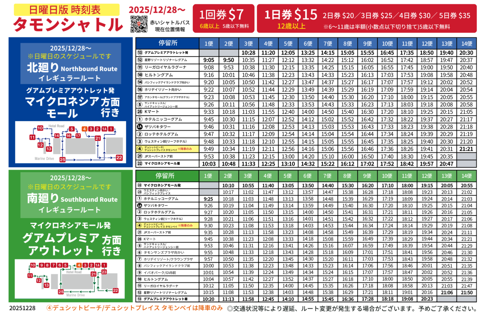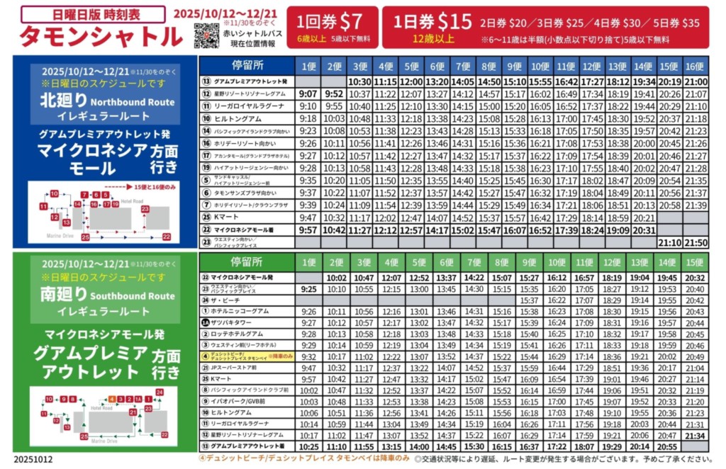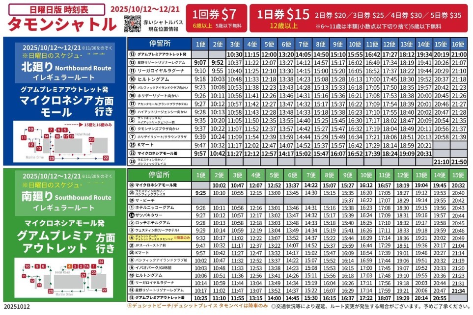 ・グアムの「赤いシャトルバス」タモンシャトル、ショッピングモールシャトル(北回り・南回り)について、以下の通りスケジュール変更および運行強化があります: