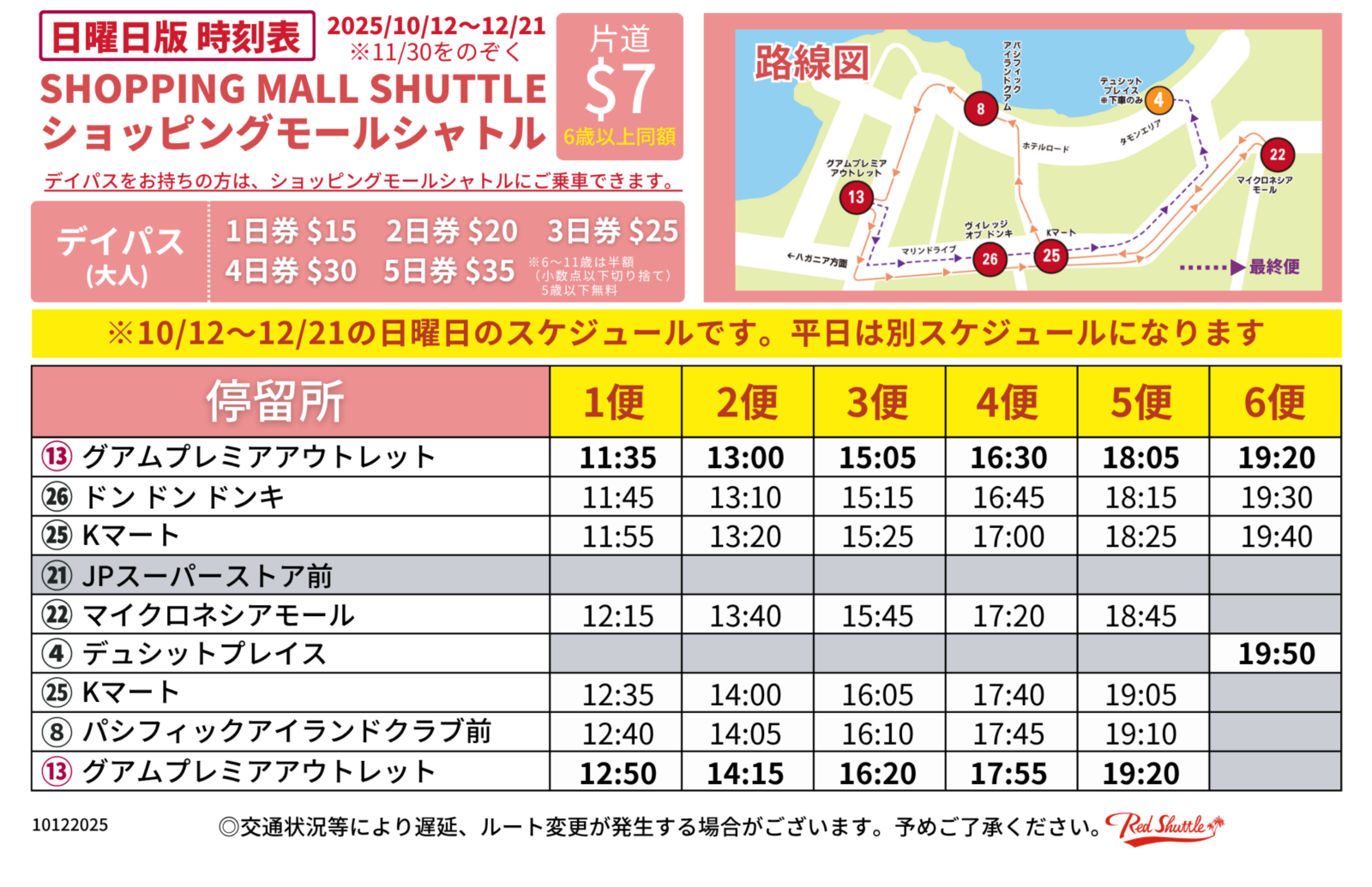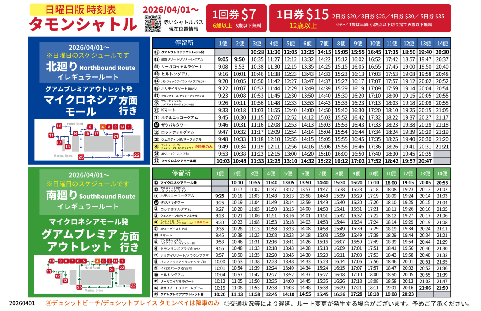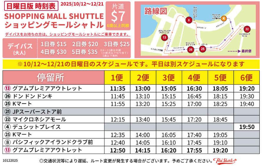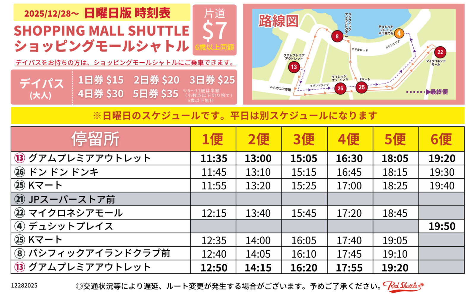 ・グアムの「赤いシャトルバス」タモンシャトル、ショッピングモールシャトル(北回り・南回り)について、以下の通りスケジュール変更および運行強化があります:
